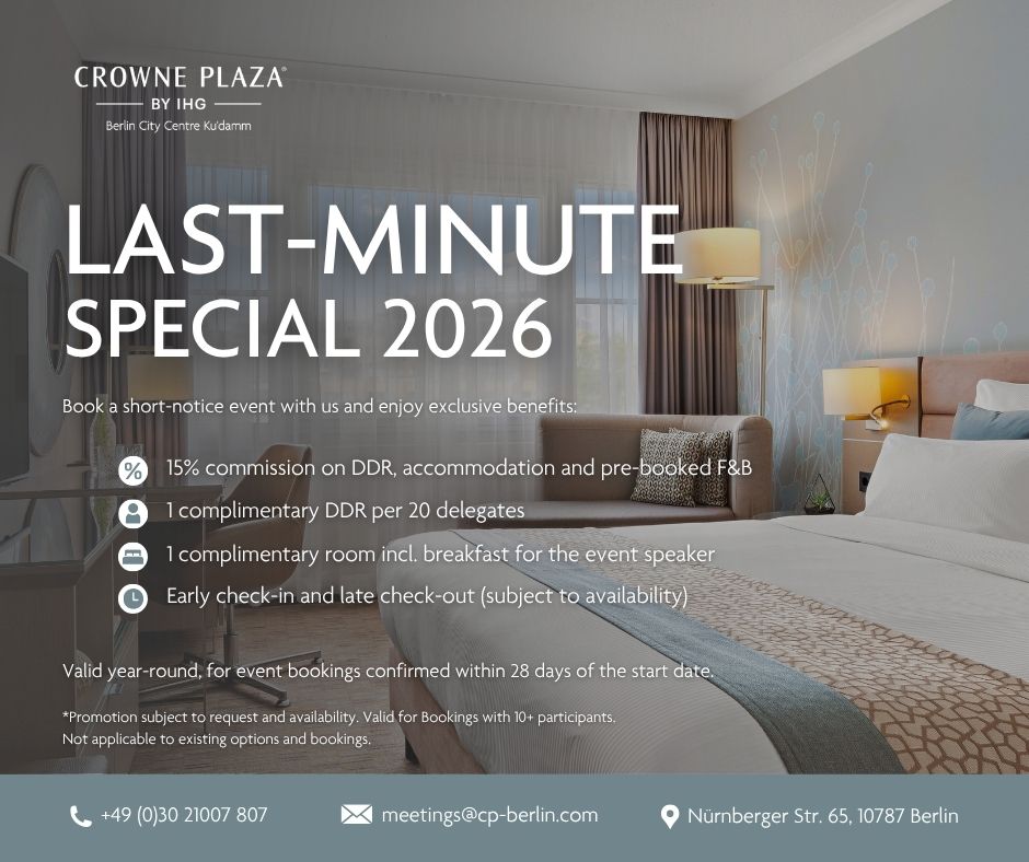 Planning a meeting or event on short notice? At Crowne Plaza Berlin City Centre Ku’damm, we make last-minute bookings seamless, efficient, and rewarding. Take advantage of our exclusive Last Minute Special 2026 and enjoy premium benefits designed for planners and delegates alike.